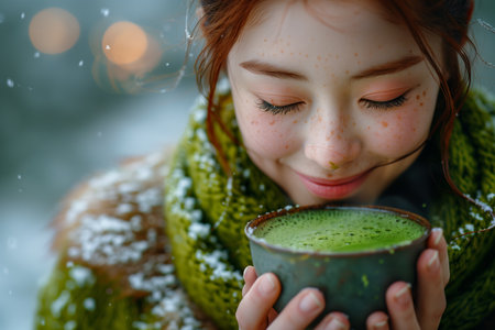 Woman Enjoying Warm Drink During Snowy Winter Day