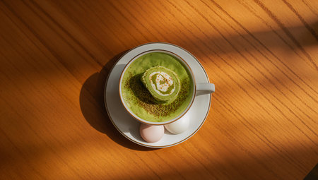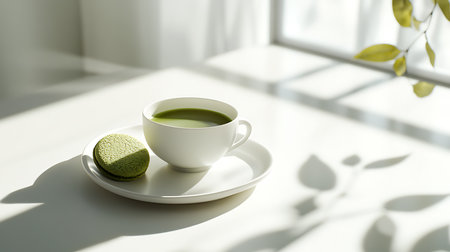 Generative AI Image of Warm Green Tea Matcha Drink with Soft Cookies and Light Shadow Background