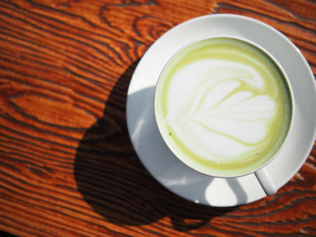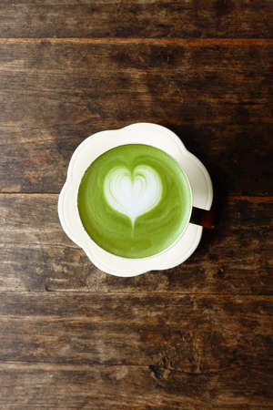 Hot matcha green tea latte art on wooden table hot caffeine drink