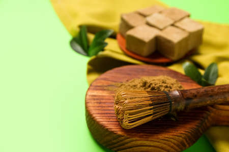 Wooden board with bamboo chasen and hojicha powder on green background, closeup