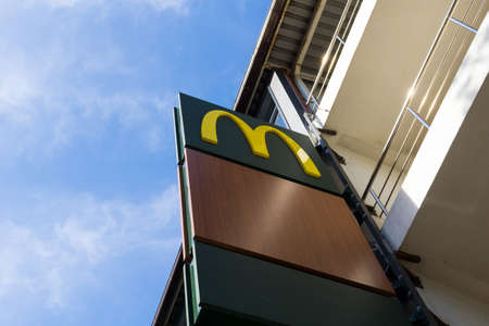 Batumi, Georgia - 04.07.2021: Signboard of McDonalds fast food cafe. Takeaway cafe work
