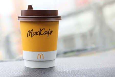 Russia, Saint Petersburg November 13, 2020: snack in the car, Breakfast with you, coffee in a yellow Cup MacCafe menu in McDonalds restaurant.