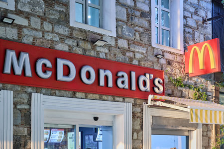Mcdonald's exterior sign on rustic stone building with windows in evening light. August 6, 2025, Bodrum Turkey.