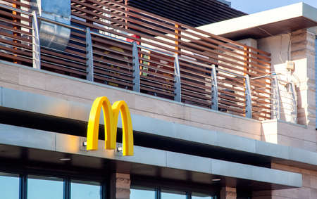 Rostov-on-Don, Russia, august 07 2021. The building of a McDonald's fast food restaurant with a close-up logo.