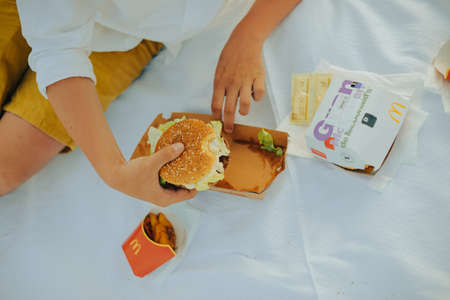 Samut Prakan Thailand - October 10, 2021 : Big hamburger in paper bag. McDonald's restaurant is a popular restaurant in Thailand.