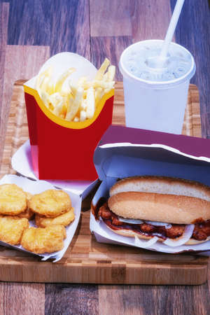 Classic fast food, with nugets, burgers, fries and shakes with packaging