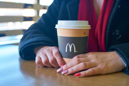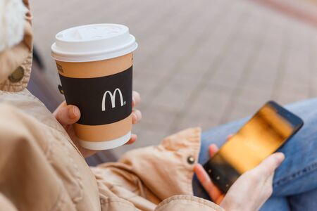 KALININGRAD, RUSSIA - CIRCA APRIL, 2018: young woman with coffee from McDonald's in Kaliningrad.