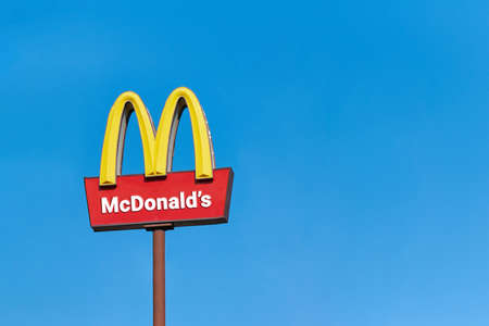 Vilnius, Lithuania - October 09, 2021: McDonalds restaurant sign over blue sky. McDonalds is an American fast food company, worlds largest restaurant chain