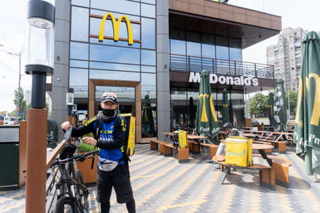 Kiev, Ukraine, May 15, 2020, Glovo deliveryman on bicycle comes to take away order from mcdonald restaurant, qurantine time at Kiev to protect from dangerous corona virus.
