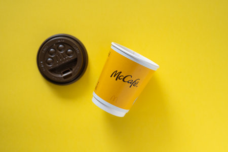 Tarragona, Spain - February 01, 2024: McDonalds hot drink on a yellow background.
