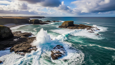 The rugged coastline is a symphony of crashing waves and jagged cliffs, where natures forces collide to create a breathtaking panorama of raw beauty.. AI generated.