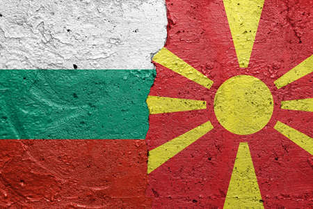 Bulgaria and North Macedonia flags - Cracked concrete wall painted with a Bulgarian flag on the left and a North Macedonian flag on the right