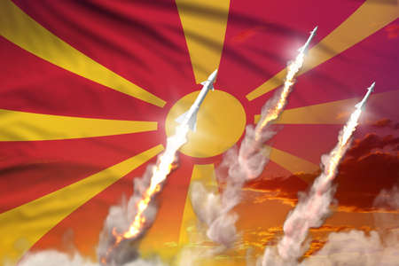 Modern strategic rocket forces concept on sunset background, Macedonia nuclear warhead attack - military industrial 3D illustration, nuke with flag