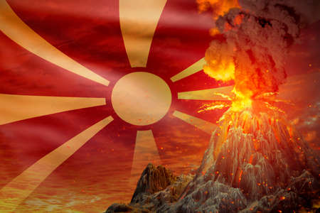 stratovolcano eruption at night with explosion on Macedonia flag background, troubles because of disaster and volcanic ash conceptual 3D illustration of nature