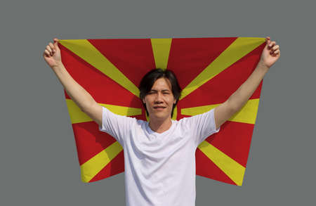 The man is holding Macedonia flag in his hands and raising to the end of the arm at the back on grey background.