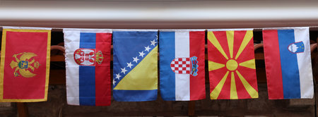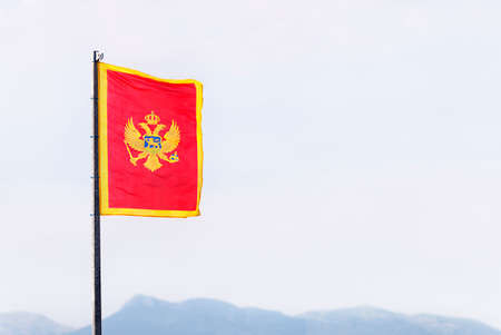 The flag of Montenegro (red, with the two-headed eagle coat of arms in the middle, and golden borders) officially adopted on 13 July 2004 in the statehood day.