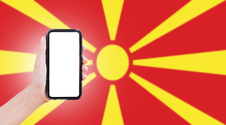 Male hand holding smartphone with blank on screen, on background of blurred flag of North Macedonia. Close-up view.
