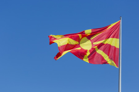 Flag of North Macedonia on blue sky. Stylized yellow sun on a red field on flag.