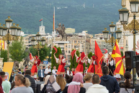 SKOPJE, NORTH MACEDONIA - AUGUST 7, 2019 : City center of Skopje with sculptures and buildings. Skopje is capital city of Macedonia, Fyrom.