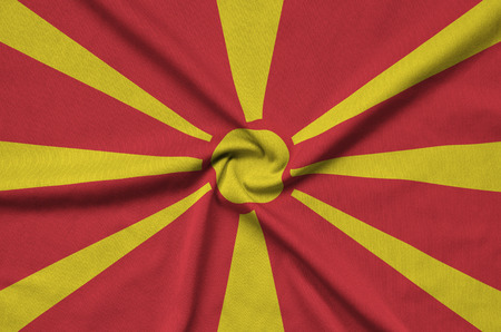 Macedonia flag is depicted on a sports cloth fabric with many folds. Sport team waving banner