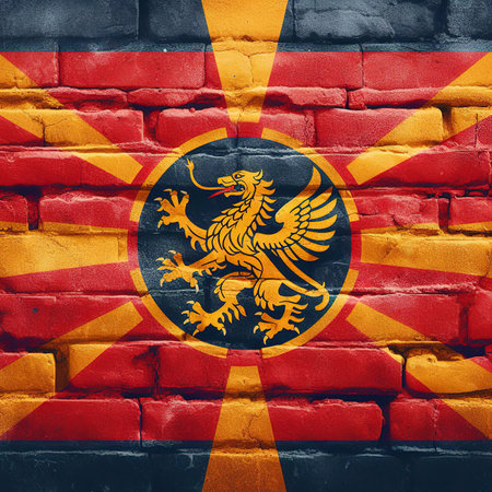 North Macedonia flag overlay on old granite brick and cement wall texture for background use