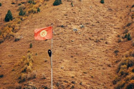 Flag in mountain. Leadership and success concept with blank red flag on mountain top.