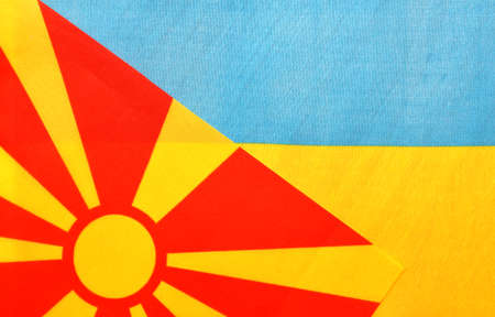 Flag of North Macedonia with cloth texture. Close up of Macedonian flag waving
