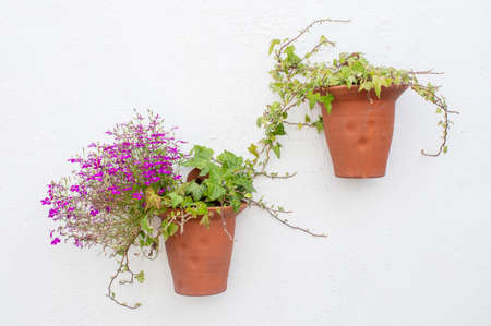 Terracotta wall pots with pink lobelia and ivy, on a white textured wall