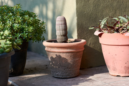 Horizontal shot of potted cactus Echinocereus rigidissimus without flower, surrounded by other potted plants in the garden of a house.