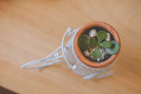 Tiny succulent plant in pot on wooden table