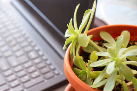 Workplace with laptop and evergreen houseplant in a pot. Home office. Side view