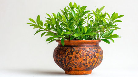 This image features a beautifully crafted terracotta pot adorned with intricate designs, filled with vibrant green leaves, showcasing a perfect blend of nature and artistry.