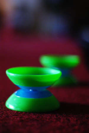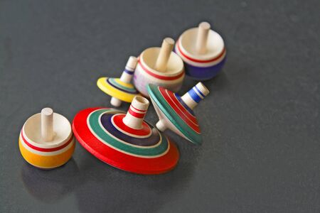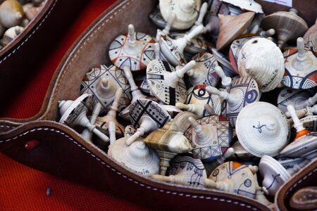 Wooden handmade painted whirligig for sale stack pile during street festival or farmer market