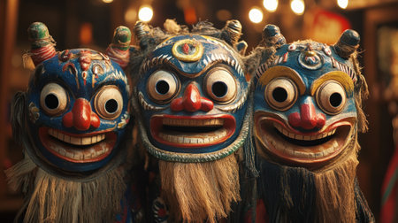 Traditional Chinese Demon Masks in a Market, Bokeh Background