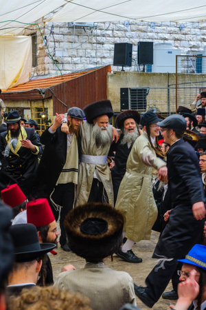 JERUSALEM, ISRAEL - FEBRUARY 25, 2016: Jewish men attend and dance, as part of a celebration of the Jewish Holyday Purim, in the ultra-orthodox neighborhood Mea Shearim, Jerusalem, Israel