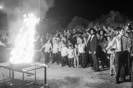 HAIFA, ISRAEL - MAY 13, 2017: A group of ultra-orthodox Jews dance around a fire, as part of the Lag BaOmer holiday celebration, in Haifa, Israel