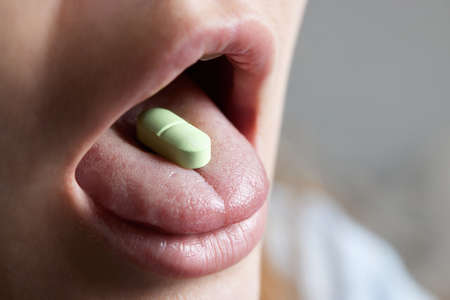 Close up of face of young woman taking drug. The drug addict is standing and putting a pill into her mouth.