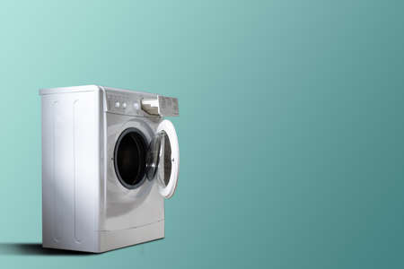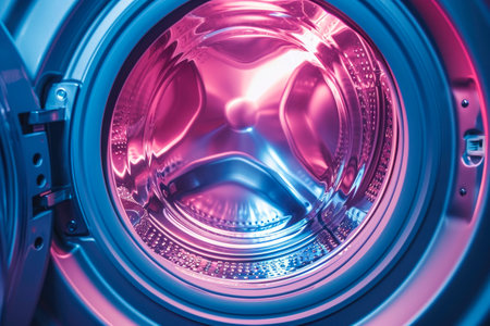 Interior of a cyan light photographed washing machine in a house