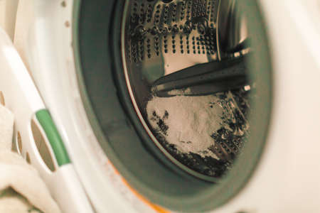 Close-up view of washing powder pouring into detergent drawer of washing machine, setting stage for efficient laundry routine in modern bathroom environment. Concept of cleanliness and housekeeping.