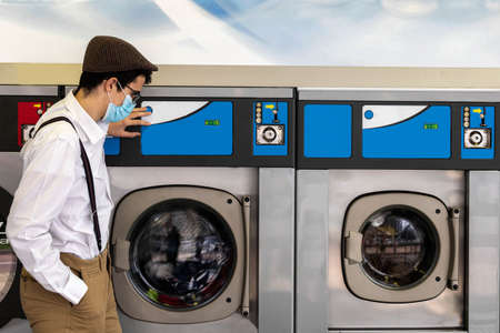 teenager with mask and cap observing how industrial washing machines work to wash the clothes he has brought from home for personal hygiene