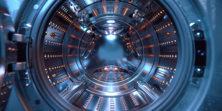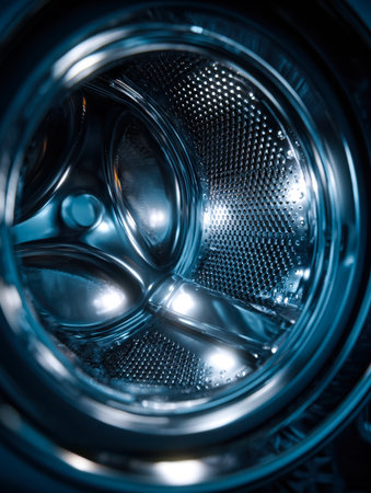 A futuristic inside view of a washing machine drum, showing the intricate design and metallic textures of modern appliances.