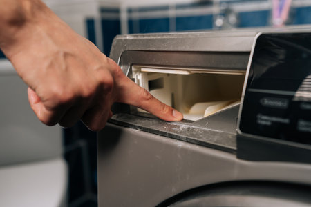 Hand reaching for detergent dispenser on washing machine, indicating process of preparing laundry cycle with cleaning products in household setting. Concept of household chores.