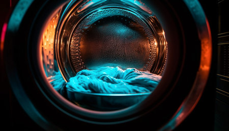 Clean clothing spinning in blue washing machine generated by artificial intelligence