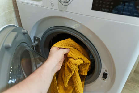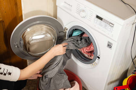 Unknown woman puts the laundry in the washing machine, inside the washing machine, closeup
