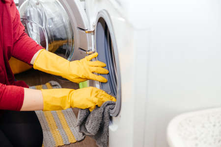 A woman in protective yellow gloves cleans a washing machine. Regular clean up.