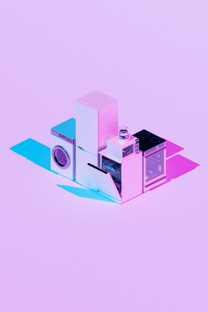 A contemporary appliances set featuring a dishwasher, washing machine, refrigerator, stove, and kettle, illuminated by soft, bright lighting that highlights their sleek and fresh design, perfect for modern home interiors, 3D illustration