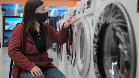 Caucasian a woman in a black antivirus medical mask picks out washer at an electronics store. The woman is wearing a red jacket and blue jeans