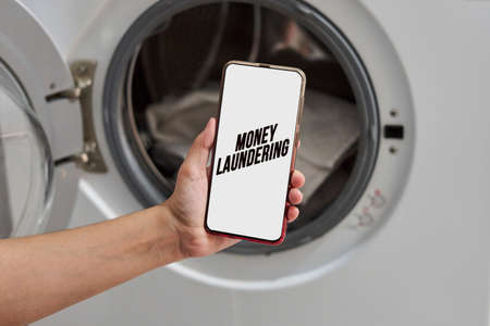 Money laundering. A woman hand holding smartphone over washing machine.