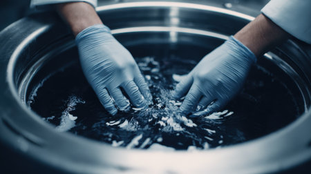 Medium shot of a technician performing drytodry hydrocarbon solvent cleaning on delicate garments in a controlled lab environment.