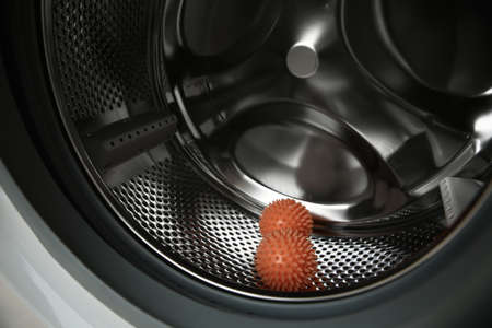 Dryer balls in washing machine drum, closeup